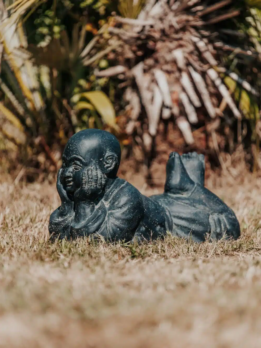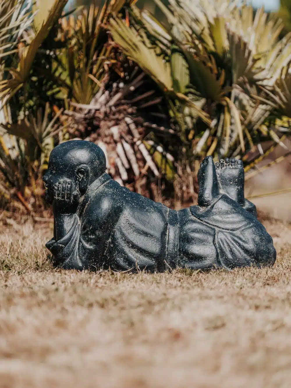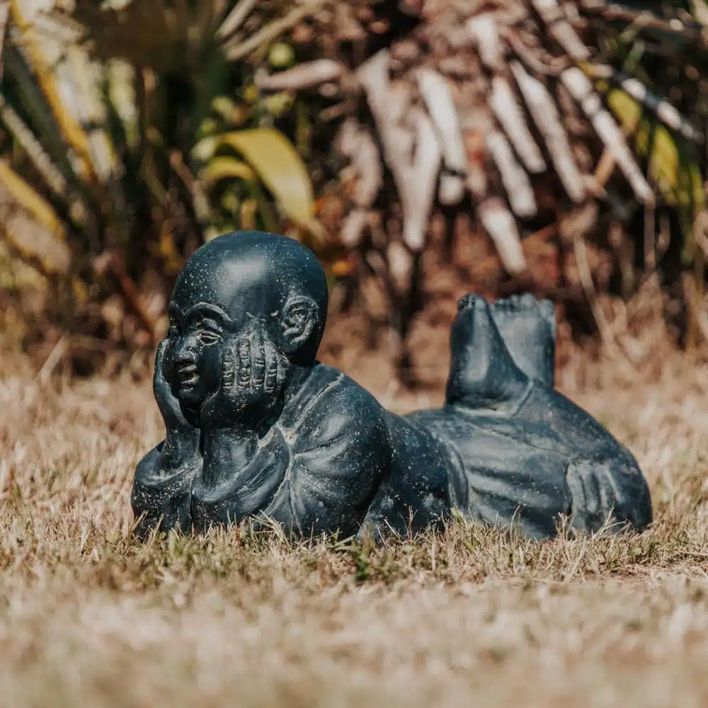 Statue de jardin moine Shaolin allongé noir antique 40cm